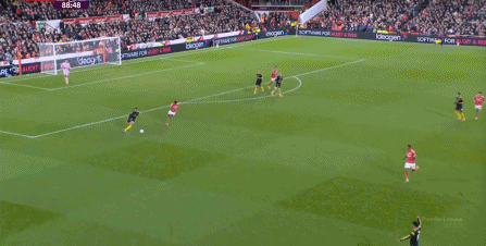 第48分钟,诺丁汉森林左右调动曼联,在右侧禁区角的位置起脚传中,欺负到了阿玛德-迪亚洛的头顶: